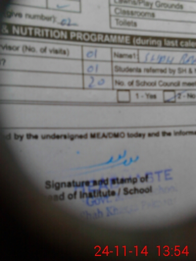 | School Visited by School Health & Nutrition Supervisor (No. of Visits) | 1 | Name1: | Shah Bano Khan | Name2: | |