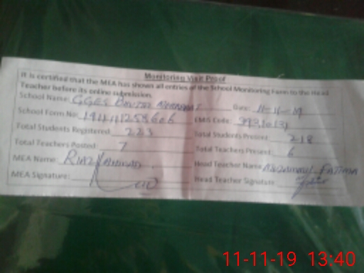 | Attendance Register | Head Teacher | MEA with School | Visit Proof |