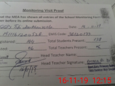 | Attendance Register | Head Teacher | MEA with School | Visit Proof |