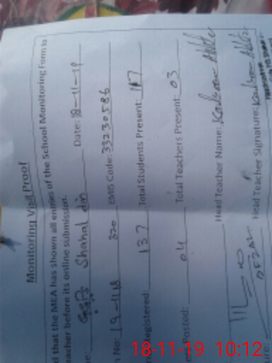 | Attendance Register | Head Teacher | MEA with School | Visit Proof |