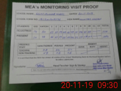| Attendance Register | Head Teacher | MEA with School | Visit Proof |