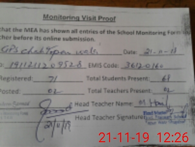 | Attendance Register | Head Teacher | MEA with School | Visit Proof |