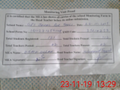 | School Visited by School Health & Nutrition Supervisor (No. of Visits) | 1 | Name1: | SAMINA KOUSAR | Name2: | Nil |