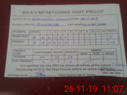 | Attendance Register | Head Teacher | MEA with School | Visit Proof |