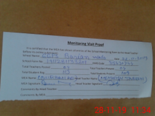 | Attendance Register | Head Teacher | MEA with School | Visit Proof |