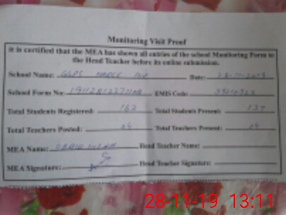 | Attendance Register | Head Teacher | MEA with School | Visit Proof |