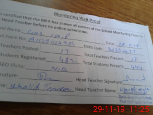 | EMIS Code: 31330027 | Name of School: GHS CHAK NO. 100/P | |||