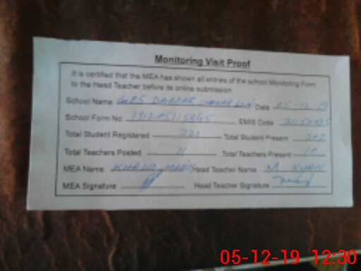 | Attendance Register | Head Teacher | MEA with School | Visit Proof |