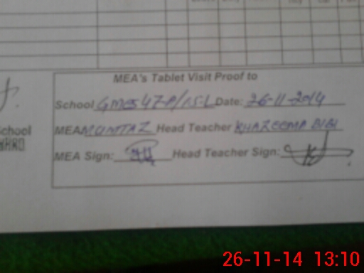 | Attendance Register | Head Teacher | MEA with School | Visit Proof |