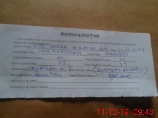 | Attendance Register | Head Teacher | MEA with School | Visit Proof |