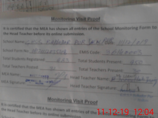 | Attendance Register | Head Teacher | MEA with School | Visit Proof |