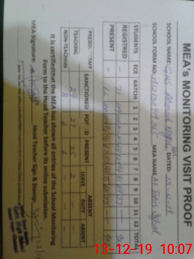 | Monitoring Date: 13-12-2019 | Start Time: 13-12-2019 09:19 AM | End Time: 13-12-2019 10:23 AM | Name of MEA: M.Ta**** Iq**** (S**** | |