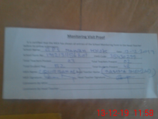 | Total no. of Classrooms: 2 No. of Classrooms Used for Teaching: 2 No. of Classrooms Storing Old Furniture, FTBs, etc: 0Comments if Any: These students discharged from one class in this school Eman Fatima Daughter Munawar Hussain Arooj Fatima Daughter of Muhammad Ashfaq Adnan Ali Son of Ghulam Mrtaza Ali Haasan Son of Ghulam Mustafa |