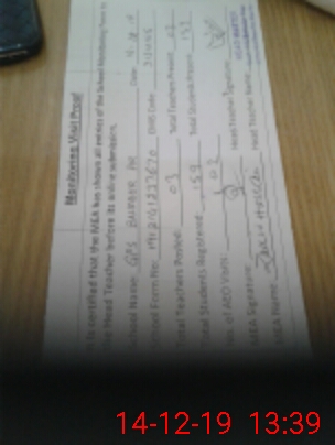 | Remarks (Use Separate Page if Required): The Feeder school data is also added In the parent school the students strength is 32 and 3 teachers In Feeder school the students strength is 127 and only Feeder teacher is teaching Overall function is satisfactory NSB RECORD WAS NOT AVAILABLE IN THE SCHOOL The data is submitted from Feeder school | |||||