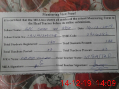 | Attendance Register | Head Teacher | MEA with School | Visit Proof |