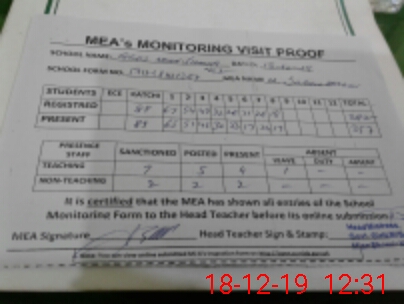 | Attendance Register | Head Teacher | MEA with School | Visit Proof |