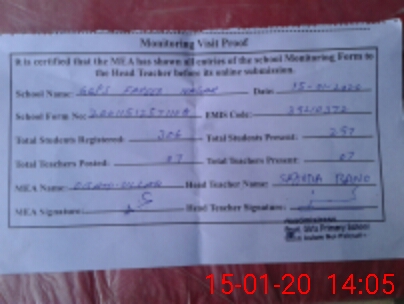 | Attendance Register | Head Teacher | MEA with School | Visit Proof |