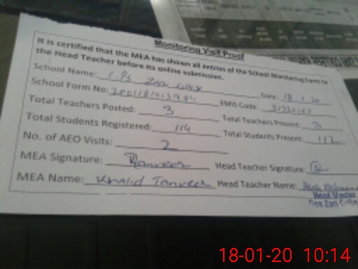 | Attendance Register | Head Teacher | MEA with School | Visit Proof |