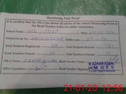 | Attendance Register | Head Teacher | MEA with School | Visit Proof |