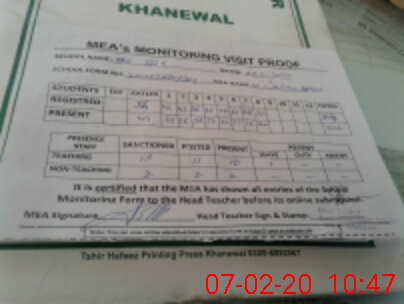 | Attendance Register | Head Teacher | MEA with School | Visit Proof |