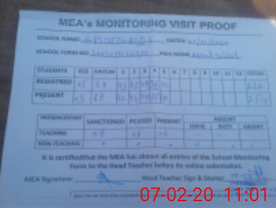 | Attendance Register | Head Teacher | MEA with School | Visit Proof |
