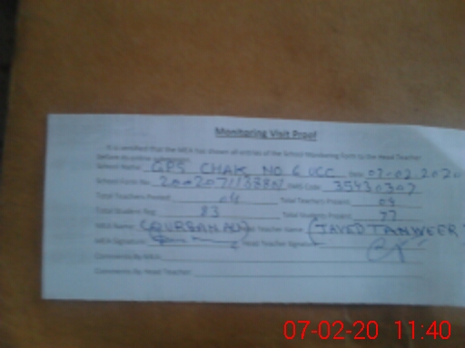 | Attendance Register | Head Teacher | MEA with School | Visit Proof |