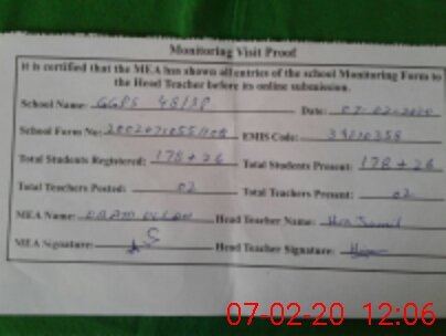 | Attendance Register | Head Teacher | MEA with School | Visit Proof |