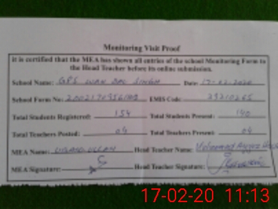 | Certified that this School was Inspected by the Undersigned MEA/DMO Today and the Information Stated Above is as Per Record. | |||||