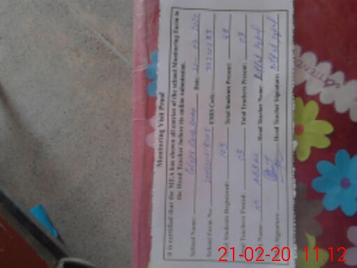 | School Visited by School Health & Nutrition Supervisor (No. of Visits) | 1 | Name1: | RAMZAN BHATTI | Name2: | NIL |
