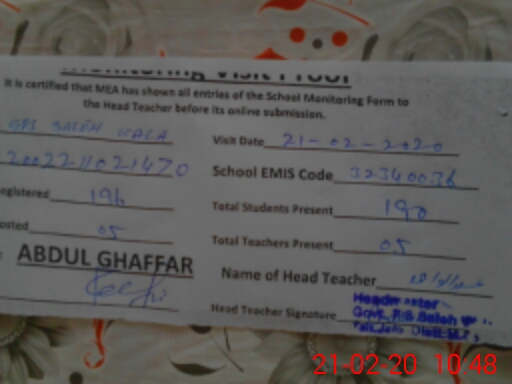| EMIS Code: 32340036 | Name of School: GPS SALEH WALA | |||