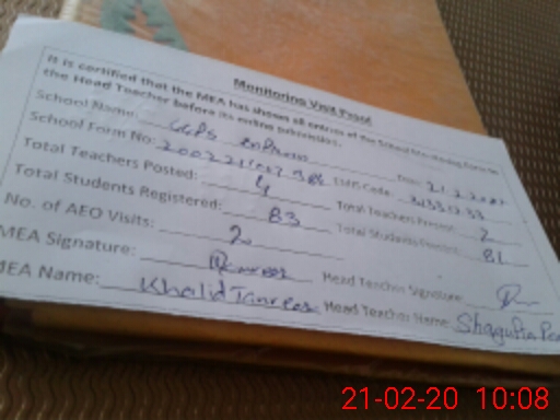 | Attendance Register | Head Teacher | MEA with School | Visit Proof |