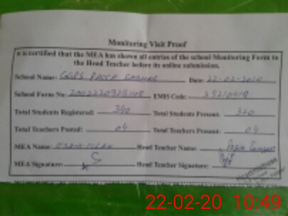 | Attendance Register | Head Teacher | MEA with School | Visit Proof |