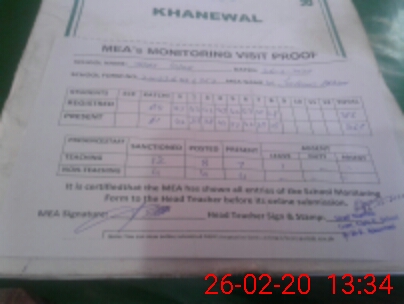 | Attendance Register | Head Teacher | MEA with School | Visit Proof |