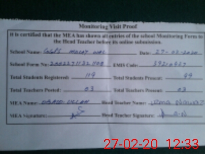 | Attendance Register | Head Teacher | MEA with School | Visit Proof |
