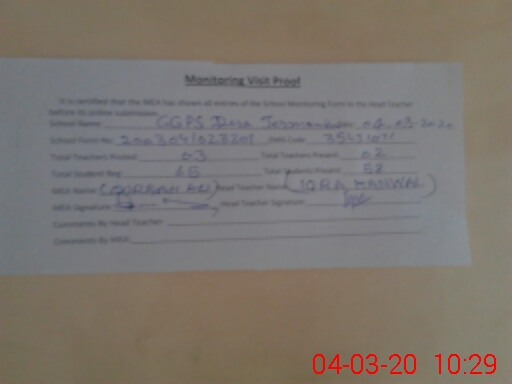 | Attendance Register | Head Teacher | MEA with School | Visit Proof |