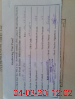 | School Visited by School Health & Nutrition Supervisor (No. of Visits) | 1 | Name1: | MUQADDAS MAHMOOD | Name2: | |