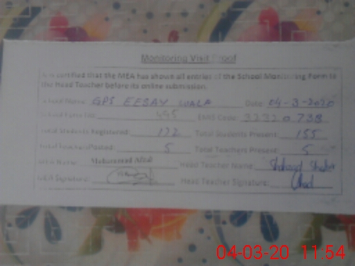 | EMIS Code: 32320738 | Name of School: GPS EESAY WALA | |||