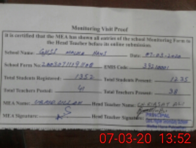 | Certified that this School was Inspected by the Undersigned MEA/DMO Today and the Information Stated Above is as Per Record. | |||||