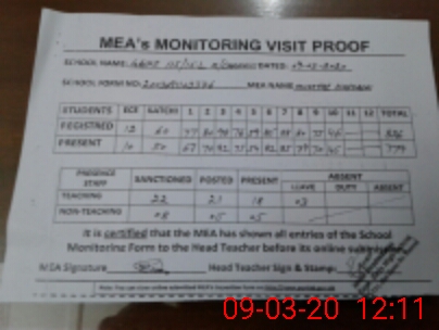| Attendance Register | Head Teacher | MEA with School | Visit Proof |