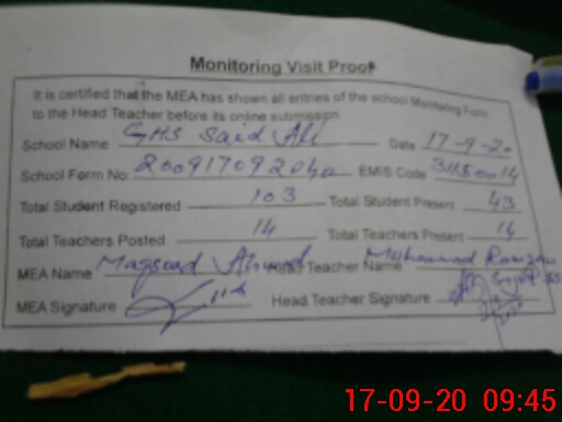 | Attendance Register | Head Teacher | MEA with School | Visit Proof |