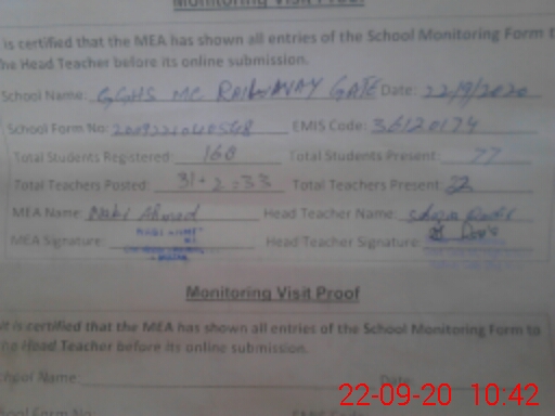 | EMIS Code: 36120174 | Name of School: GGHS MC RAILWAY GATE SHUJABAD | |||