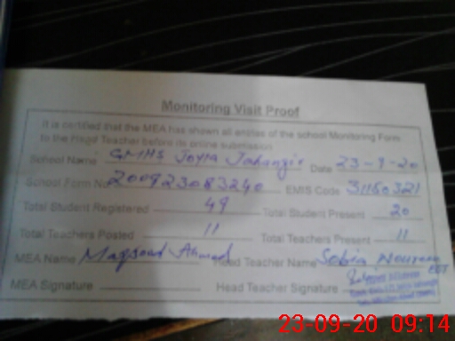 | EMIS Code: 31150321 | Name of School: GMHS JOYIA JAHANGIR | |||