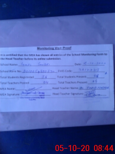| Remarks (Use Separate Page if Required): 1 Student list for verifications class 4rh in tab being shown previous session required to be updated please 2 amount of last fund received Rs 26521 in Nsb on 23rd Dec 19 not updated in sis 3 amount of class room Rs 410983 retransferred in school Nsb account 2nd September 20 4 school health and nutrition supervisor not visited this school from Feb 20 to onward | |||||