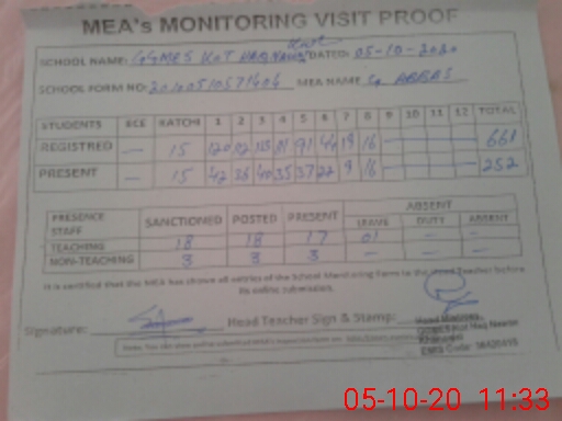 | Certified that this School was Inspected by the Undersigned MEA/DMO Today and the Information Stated Above is as Per Record. | |||||