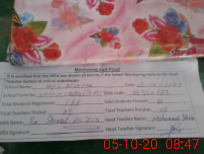 | Attendance Register | Head Teacher | MEA with School | Visit Proof |