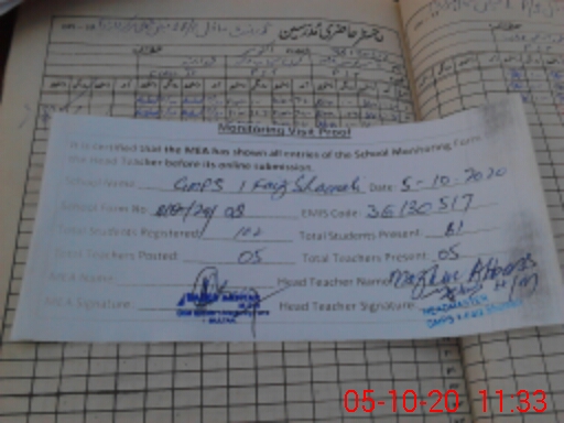 | Attendance Register | Head Teacher | MEA with School | Visit Proof |