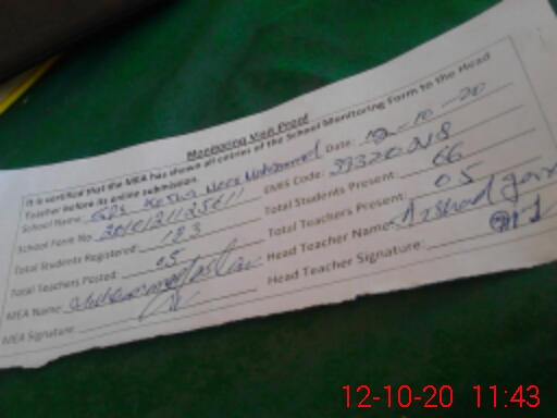 | Attendance Register | Head Teacher | MEA with School | Visit Proof |