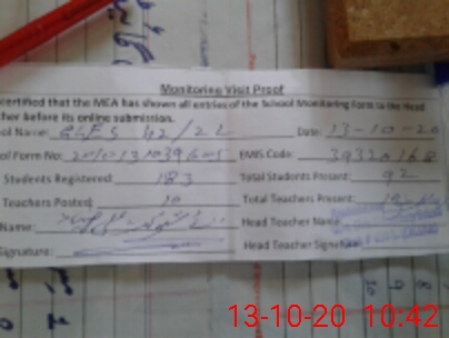 | Attendance Register | Head Teacher | MEA with School | Visit Proof |