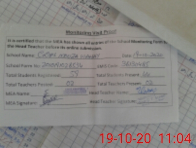 | Attendance Register | Head Teacher | MEA with School | Visit Proof |