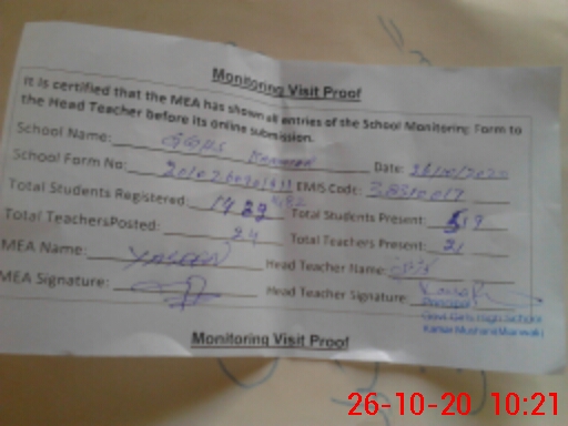 | Monitoring Date: 26-10-2020 | Start Time: 26-10-2020 09:00 AM | End Time: 26-10-2020 10:22 AM | Name of MEA: Gh**** Ya**** (R**** | |